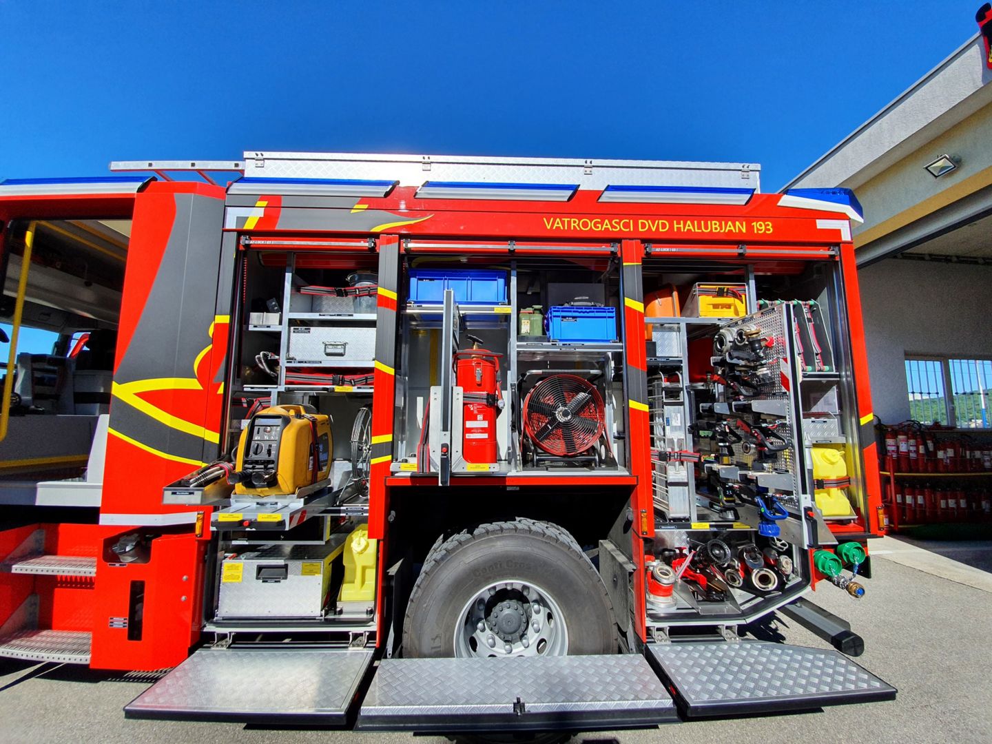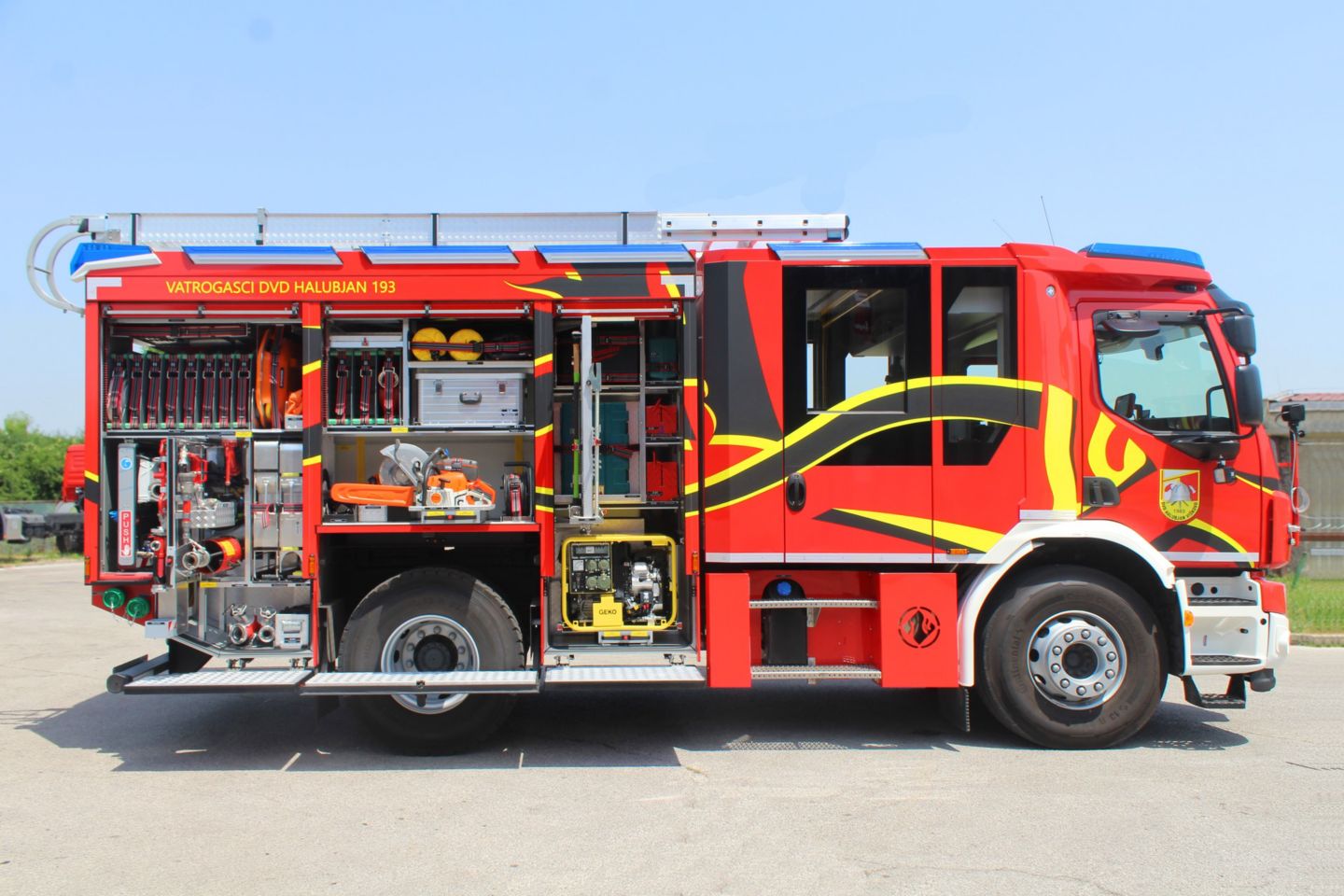 “Novi Volvo FE predstavlja ispunjenje svih želja vatrogasaca DVD-a Halubjan, kako ove generacije tako i starijih generacija koje su marljivo svojim radom gradili društvo da dođe do ovog nivoa. Ovo moderno vozilo sa svojim tehničkim karakteristikama zadovoljava sve standarde i trendove koji su u ovom trenutku prisutni u vatrogasnoj struci vezano za vatrogasnu tehniku. Vozilo je opremljeno s momčadskom kabinom za 6 vatrogasaca, spremnikom vode od 3000 litara, centrifugalnom vatrogasnom pumpom srednjeg i visokog tlaka 30/10, vučnim vitlom od 5,5 tona, rasvjetnim stupom, hidrauličkom opremom za spašavanje u prometu te svom opremom i armaturama za gašenje požara i opremom za zaštitu vatrogasaca.